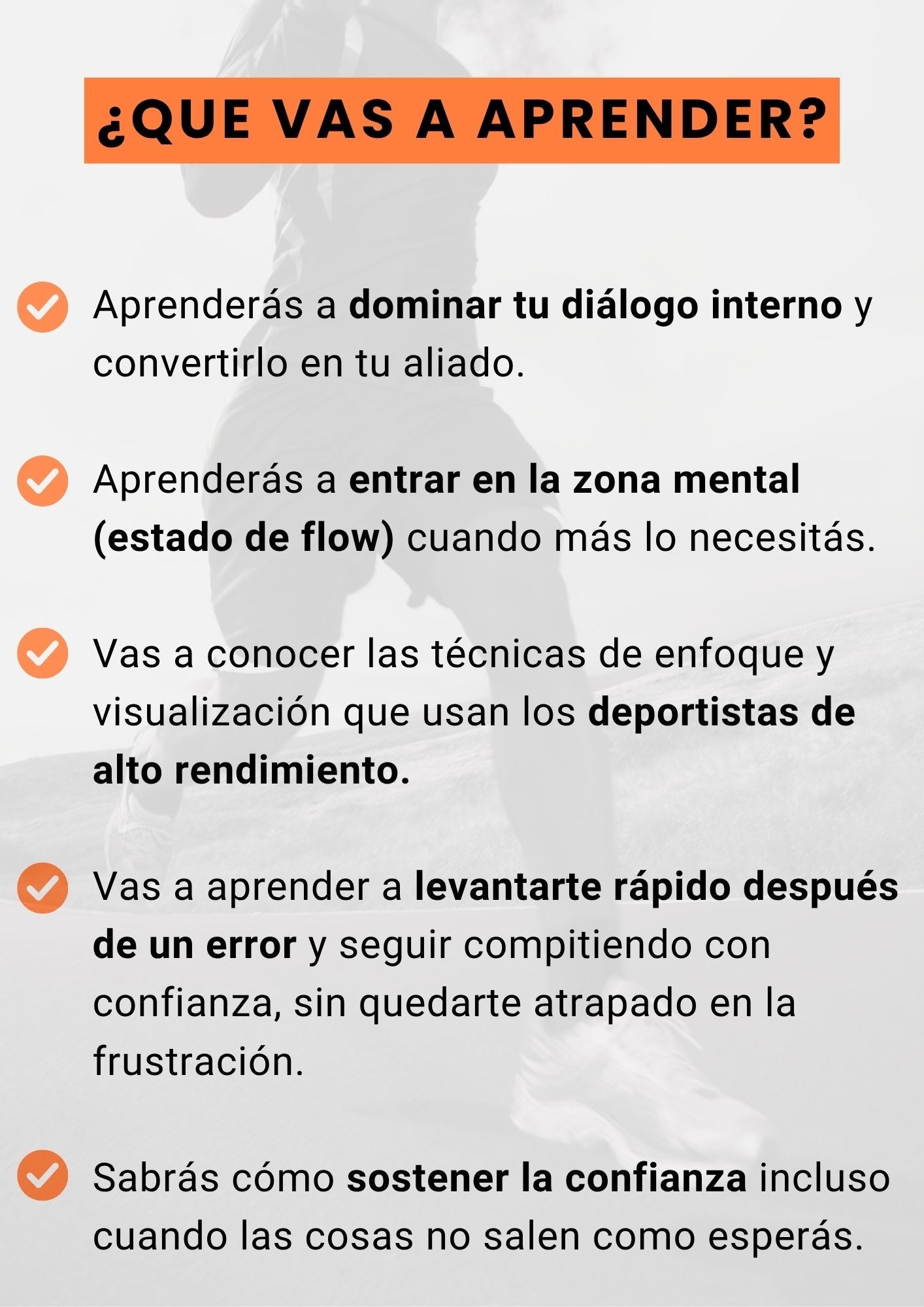 Mayor enfoque, más confianza, menos ansiedad y una mentalidad más firme frente al error o la presión. En resumen: vas a pensar, entrenar y competir distinto. Ese es el verdadero cambio.